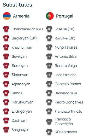 直播吧09月06日讯 世预赛欧洲区小组赛F组,亚美尼亚vs葡萄牙,赛前双方首发公布!由于此前参加欧国联,本场比赛是葡萄牙本届世预赛的第一场比赛。