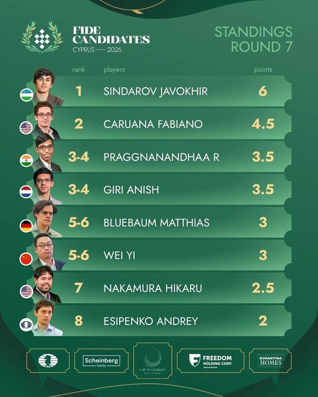 本轮其他三盘均下成和棋。辛达洛夫对阵吉里一度取得优势,但吉里防守功力深厚,双方在第85步握手言和。普拉格纳南达与卡鲁阿纳一战,印度棋手采用斯拉夫防御,但卡鲁阿纳的应对令前者花费了大量时间思考,最终双方三次重复后作和。布鲁鲍姆同样在中村光的坚韧防守中无功而返。这样,前7轮结束,乌兹别克斯坦新星辛达洛夫表现抢眼,以6分领跑,比身后的卡鲁阿纳多了1.5分。普拉格纳南达和吉里同为3.5分,实现首胜的韦奕与布鲁鲍姆同积3分。中村光2.5分,埃西彭科2分垫底。